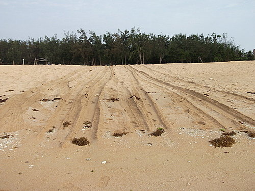 拖上岸的海菜在沙灘上留下了一道道的痕跡