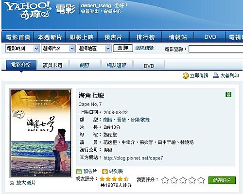 從去年的練習曲、色戒到今年的海角七號,每個不同題材的故事,在導演、編劇、演員、電影人執著的投入,真的讓我覺得國片又再度燃燒起大家的希望,讓這片土地各個角落上的人民又有了最大公約數的交集;也激起了我再找時間去看冏男孩、九降風的念頭,除了希望能看到一部好的電影之外,身為小老百姓的我們真的沒有比去電影院看電影更實際支持國片的作法了