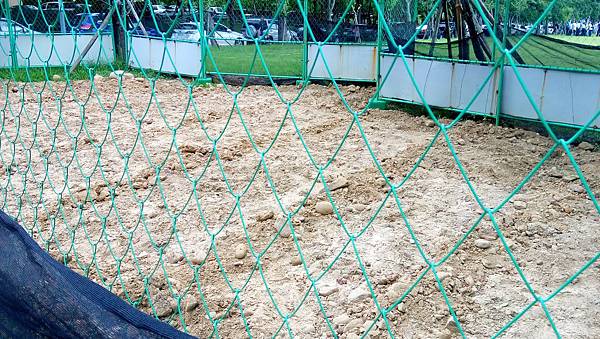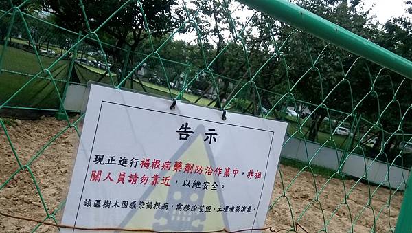 院區的草坪上,原先種植樹木的區域圍了鐵網,上頭的告示寫著"褐根病(Brown Root Rot)"。