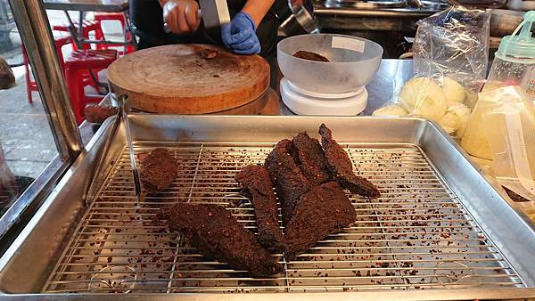 <牛干巴: 秤重賣,750元/斤,我買了一塊請老闆切片,就當成零食吃囉>
