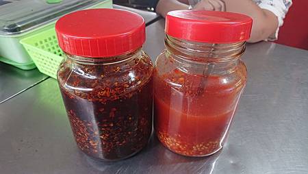 桌上有兩罐自製的醬料,左邊是辣醬、右邊是酸醬。