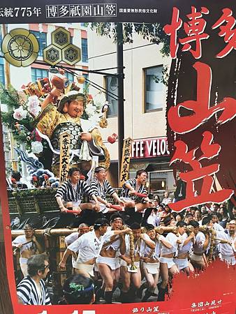 櫛田神社是博多的氏神和總鎮守而聚集當地人的信仰,每年七月(7/1~7/15)會舉辦盛大的博多祇園山笠祭(為博多三大祭典之一),從海報上可得知此祭典迄今(2016年)已有775年歷史。