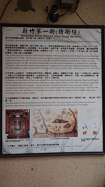 看了旁邊的簡介,才知道這裡約莫300多年前(至於是哪一年? 居然有三種說法: 1691年? 1711年? 1718年?前後差了有二十多年),首度有人來此開墾,因此稱為"新竹第一街",所謂的"暗街仔"大約是現今 平和街 和 東前街 一帶的範圍。