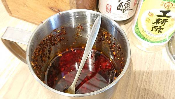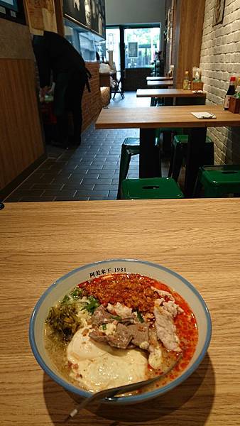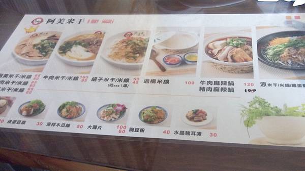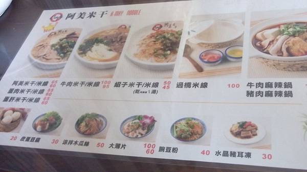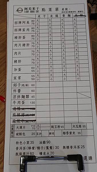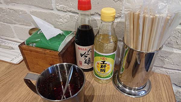 菜單就是傳統的米干、米線,以及常見的黃麵。桌上的醬料並沒有太特別(大吟釀醬油、工研醋、辣椒醬也跟其他店家市售產品類似,並沒有特別辣)。餐具用的是免洗筷,本來我還以為會是用傳統早期的筷子,放在筷子欄裡面...感覺這樣才符合當初寫的"眷村懷舊風味"用餐環境。(p.s 這點就有點小失望了)
