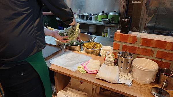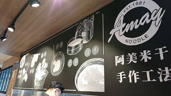 廚房看起來有點像是開放式廚房,但也不是全透明的,烹煮區的上方掛著簡單的設計,介紹米干的製作步驟(泡米、磨米、上漿、蒸煮、晾涼、切絲)。