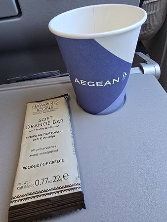 空服員發了一小杯礦泉水和一片小小的甜食(NAVARINO ICONS: SOFT Orange Bar with honey&sesame) 柑橘口味加上白芝麻的軟糖。