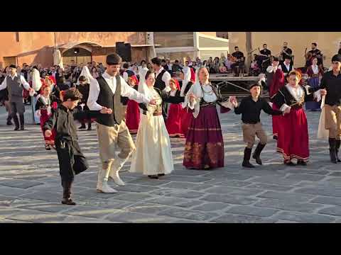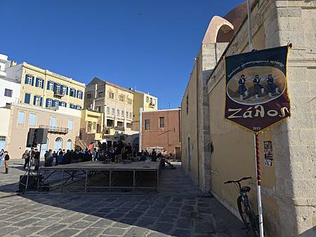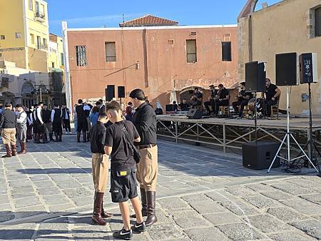 下午巧遇當地的表演團體 "Ζάλος" (Zalos) 官方FB,進行一場傳統舞蹈表演(https://youtu.be/W7VWV0SzwV8),大夥手拉手圍個圈圈(但並沒有實際圍成一圈,而是留有縫隙); 隨著音樂伴奏,大家輪流來到圓圈的中間跳起舞來,這個舞蹈的重點好像在於"腳的踢踏旋律",兩隻手都要一直維持著舉手的姿勢; 跳完之後又回到原先的隊伍裡面位置,與其他同伴手牽著手。
